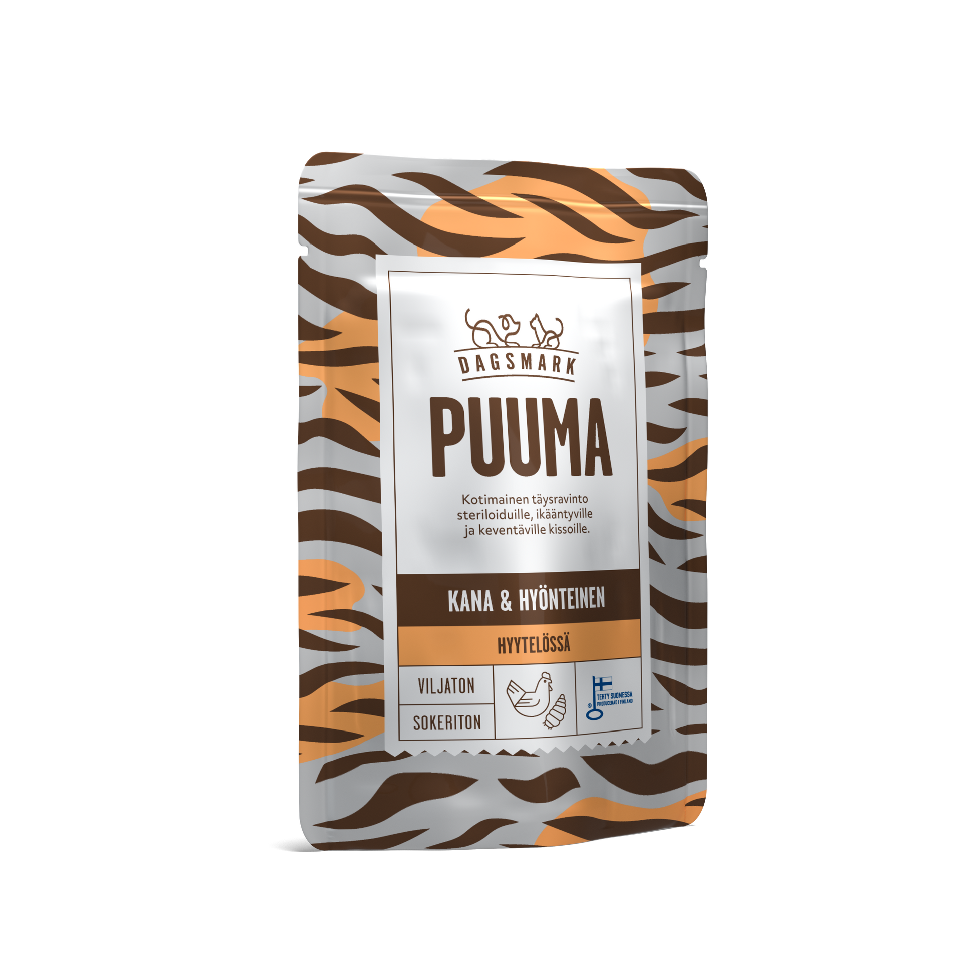 Dagsmark PUUMA -märkäruoassa on maukas, vähärasvainen ja proteiinipitoinen koostumus. Se sopii erityisesti leikatuille kissoille ja vähemmän aktiivisille sisäkissoille sekä seniorikissoille. Dagsmark PUUMA sisältää suomalaista tuoretta kanaa Naapurin Maalaiskanasta sekä ekologista mustasotilaskärpäsen toukkaa. Märkäruoka ei sisällä viljaa, soijaa, lisättyä sokeria eikä säilöntä- tai väriaineita.