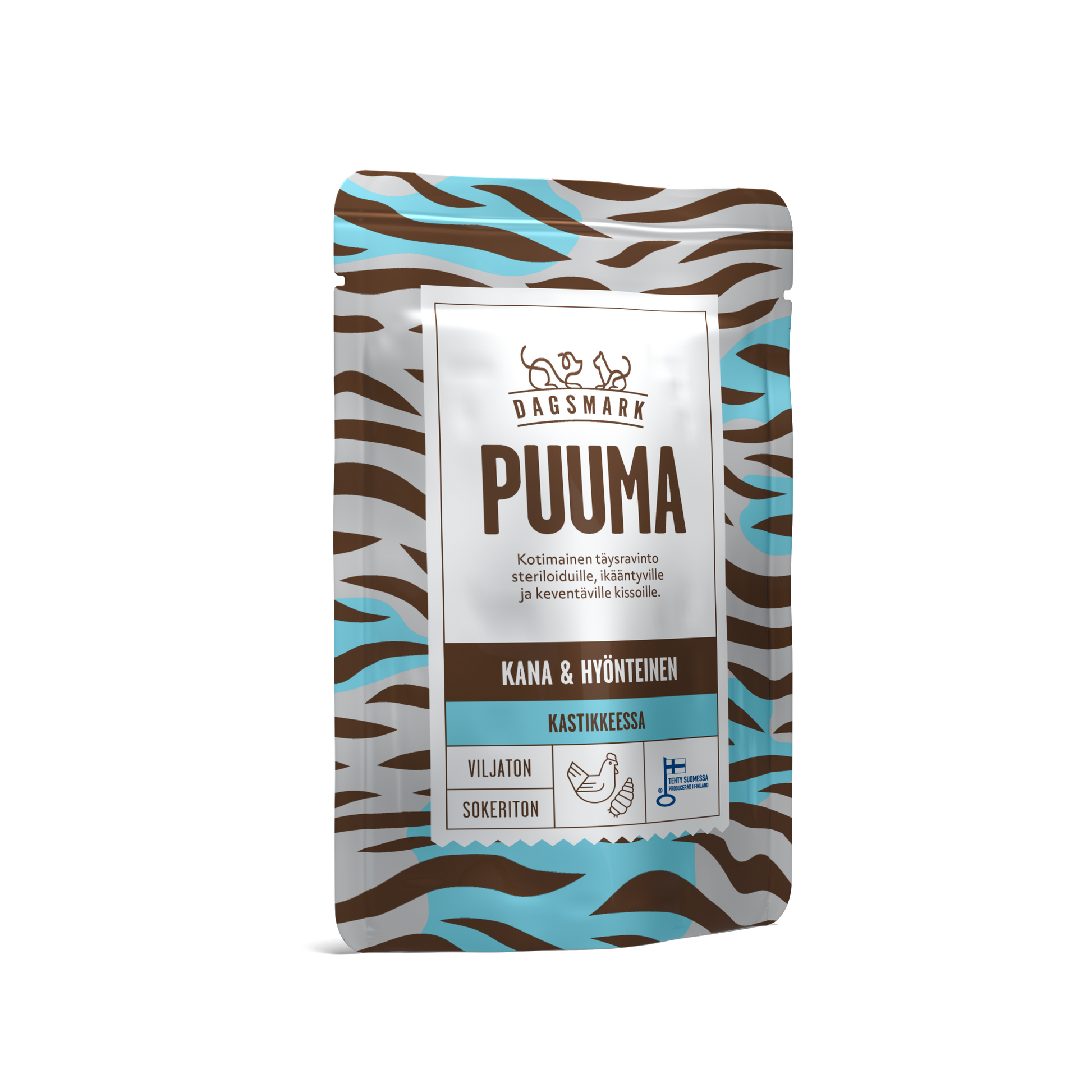 Dagsmark PUUMA -märkäruoassa on maukas, vähärasvainen ja proteiinipitoinen koostumus. Se sopii erityisesti leikatuille kissoille ja vähemmän aktiivisille sisäkissoille sekä seniorikissoille. Dagsmark PUUMA sisältää suomalaista tuoretta kanaa Naapurin Maalaiskanasta sekä ekologista mustasotilaskärpäsen toukkaa. Märkäruoka ei sisällä viljaa, soijaa, lisättyä sokeria eikä säilöntä- tai väriaineita.