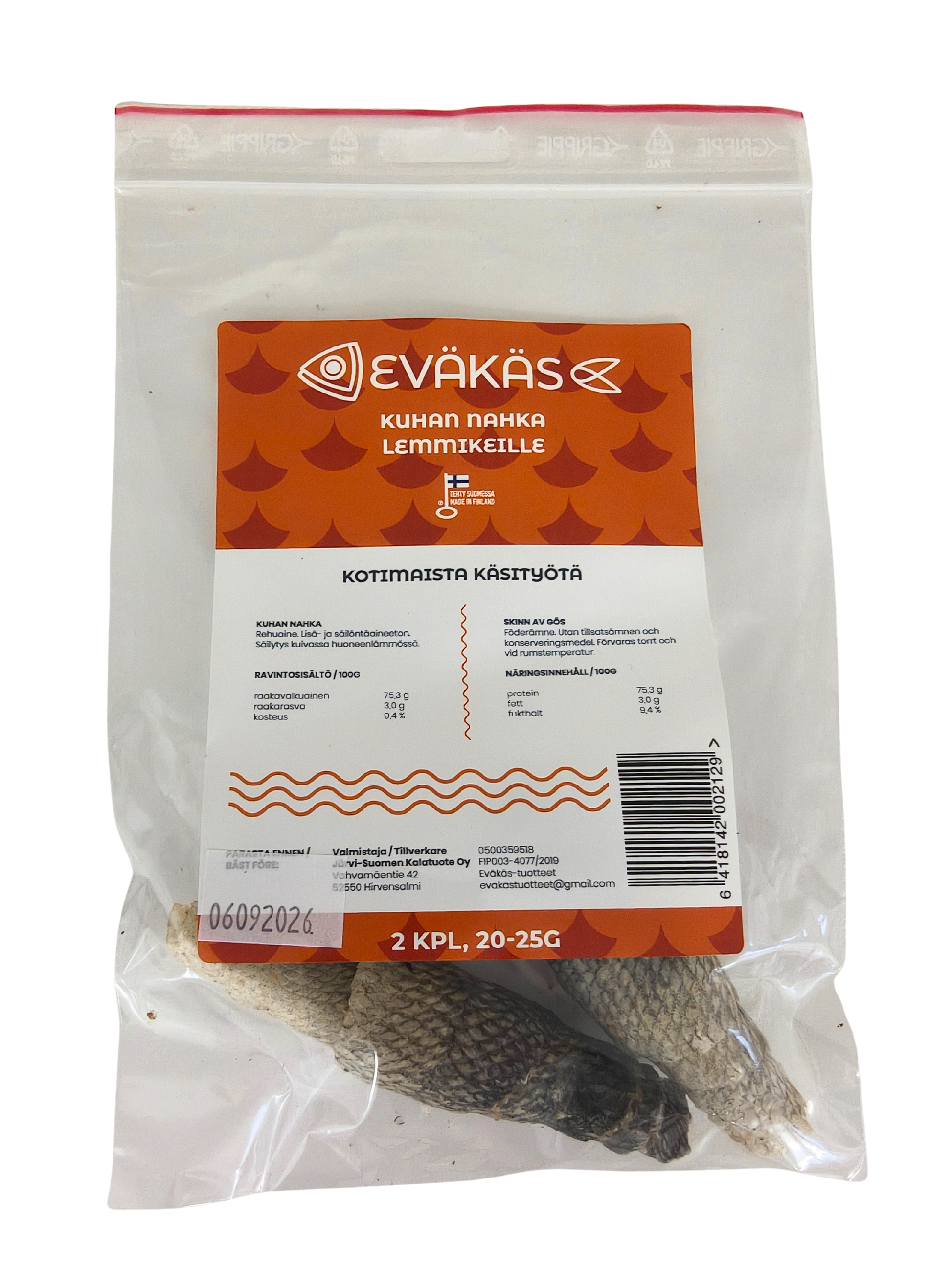 Suomalainen kuivattu kuhannahka kätevässä uudelleensuljettavassa noin 20-25 g pussissa. Ekologinen, lisä- ja säilöntäaineeton. Kuivattu elintarvikelaatuisesti Hirvensalmella. Pussissa on 2 kpl nahkoja, joiden koko voi vaihdella. Mainio herkku lemmikille!