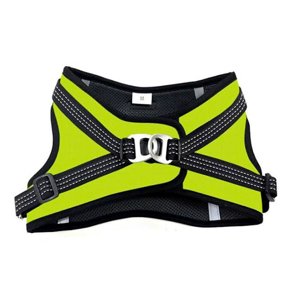 Helppo pukea, reilusti ympäryksen säätövaraa. Turvallinen pennuille ja pienille koirille. Keltainen huomioväri selkäpuolella. Heijastimet lisäävät näkyvyyttä pimeällä.