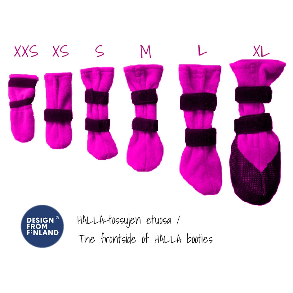 HALLA tossut ovat suositut pitkävartiset tossut, joita on paranneltu entistäkin paremmiksi. Niissä on uusi pehmeämpi ja laadukkaampi fleece. Tossuihin on tehty halkio etuosaan ja yläosaan tarranauhakiinnitys (toista tarranauhaa ei ole xxs ja xs -kooissa). XL-koossa on lisäksi vahvistettu kärki. Pohjamateriaali on notkea, vettähylkivä ja pakkasenkestävä liukuestemateriaali. Tossut suojaavat pakkaselta ja lumen paakkuuntumiselta tassuihin. Tossuja voi käyttää myös sisällä kipeän / haavaisen tassun suojana ja estämään liukastumista liukkailla pinnoilla. Ripustuslenkillä saa tossut helposti laitettua kuivumaan.