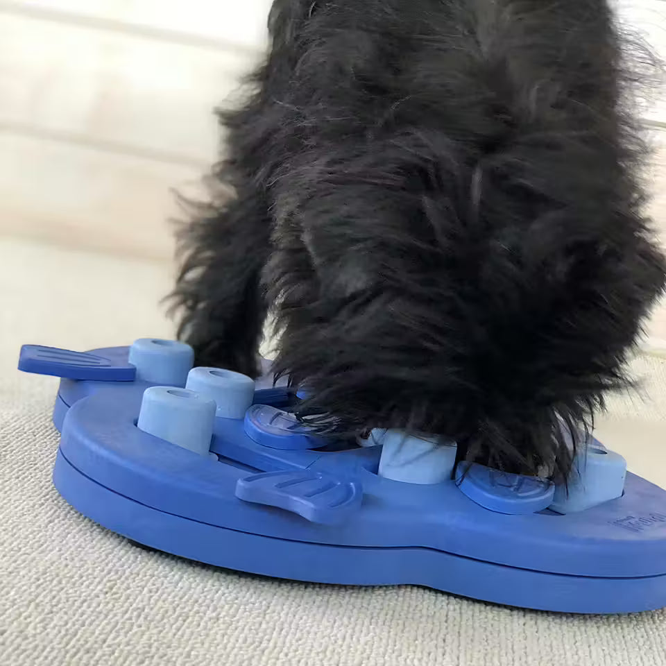 Mikäli lelu tuntuu liian haastavalta, voit siirtää räpylän muotoisia läpysköitä pois lokeroiden päältä ja näyttää koiralle, miten palikat liikkuvat. Kannusta koiraa haistelemaan ja tutkimaan lelua!