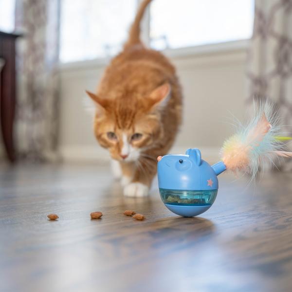 Leikkiohje: Kierrä lelun häntä irti ja täytä lelu kissan nameilla tai kuivatuilla herkuilla. Voit säätää lelun vaikeusastetta: lelun pohjaa kiertämällä voit muuttaa annosteluaukon kokoa - suuremmasta aukosta herkut tippuvat helpommin kuin pienestä.