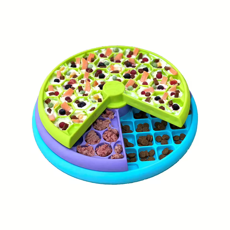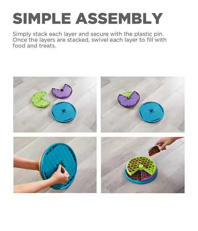 Aseta herkkuja tai ruokaa kupin lokeroihin kaikille kolmelle tasolle. Kerroksia pyörittämällä koira pääsee käsiksi seuraavaan kerrokseen.