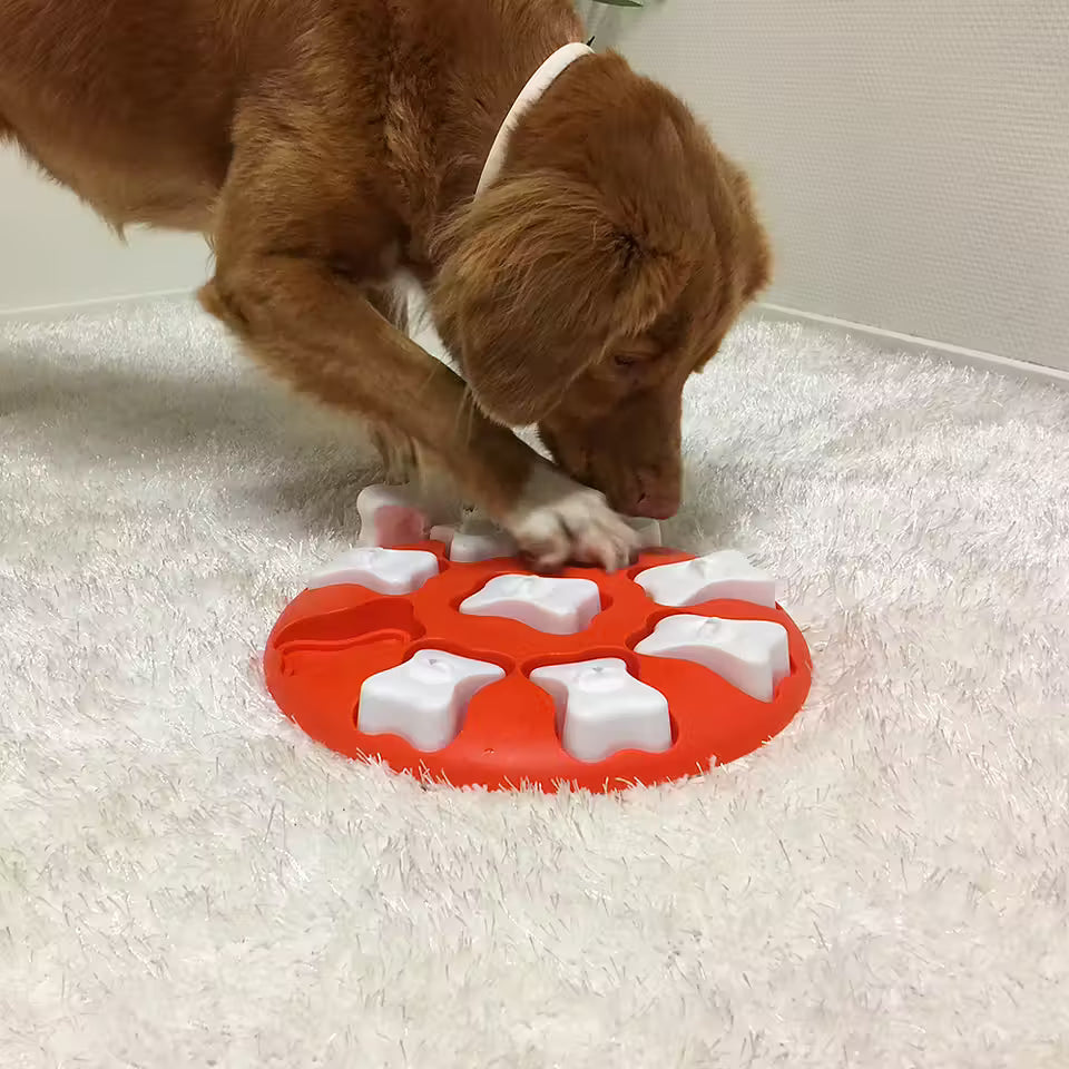Leikkiohje: Aseta herkkuja tai ruokaa pohjan lokeroihin. Peitä herkkulokerot luukuvioilla. Anna koiralle ratkaistavaksi!