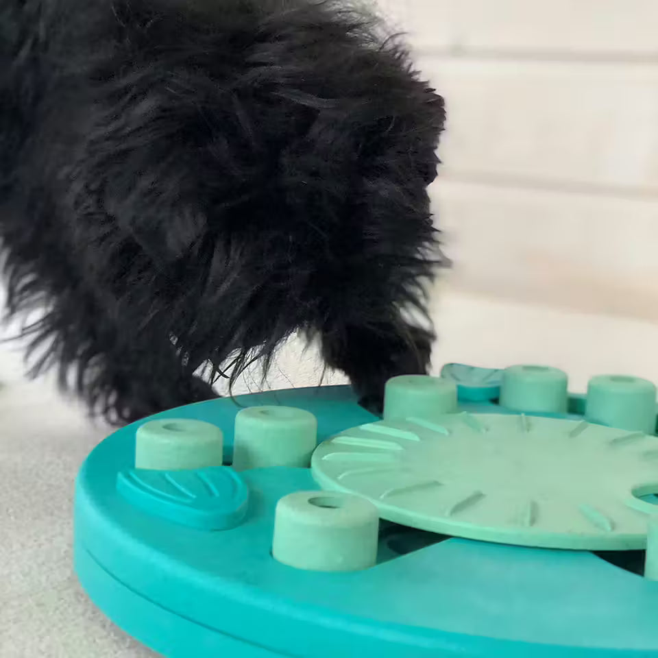 Mikäli lelu tuntuu liian haastavalta, voit siirtää räpylän muotoisia läpysköitä pois lokeroiden päältä ja näyttää koiralle, miten palikat liikkuvat. Kannusta koiraa haistelemaan ja tutkimaan lelua!