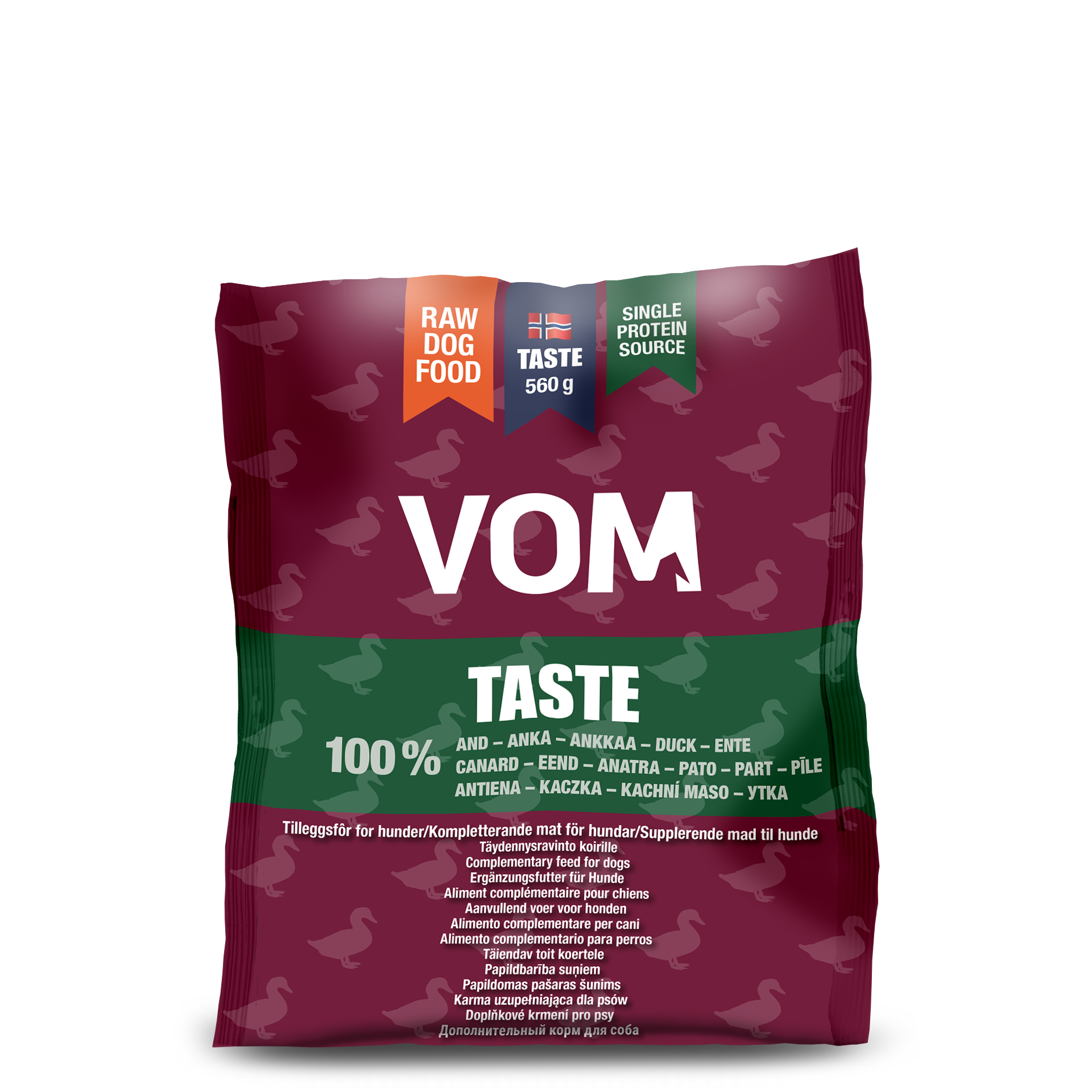 VOM TASTE -sarjan tuotteet sisältävät vain yhtä eläintä. Tuotteet sopivat hyvin esimerkiksi allergiselle koiralle ja eliminaatiodieetin toteuttamiseen. Norjalaiset VOM Taste -sarjan tuotteet soveltuvat kaikkien koirien ruokintaan osana raakaruokaseosta, kuivaruokaan sekoitettuna tai lisukkeena.