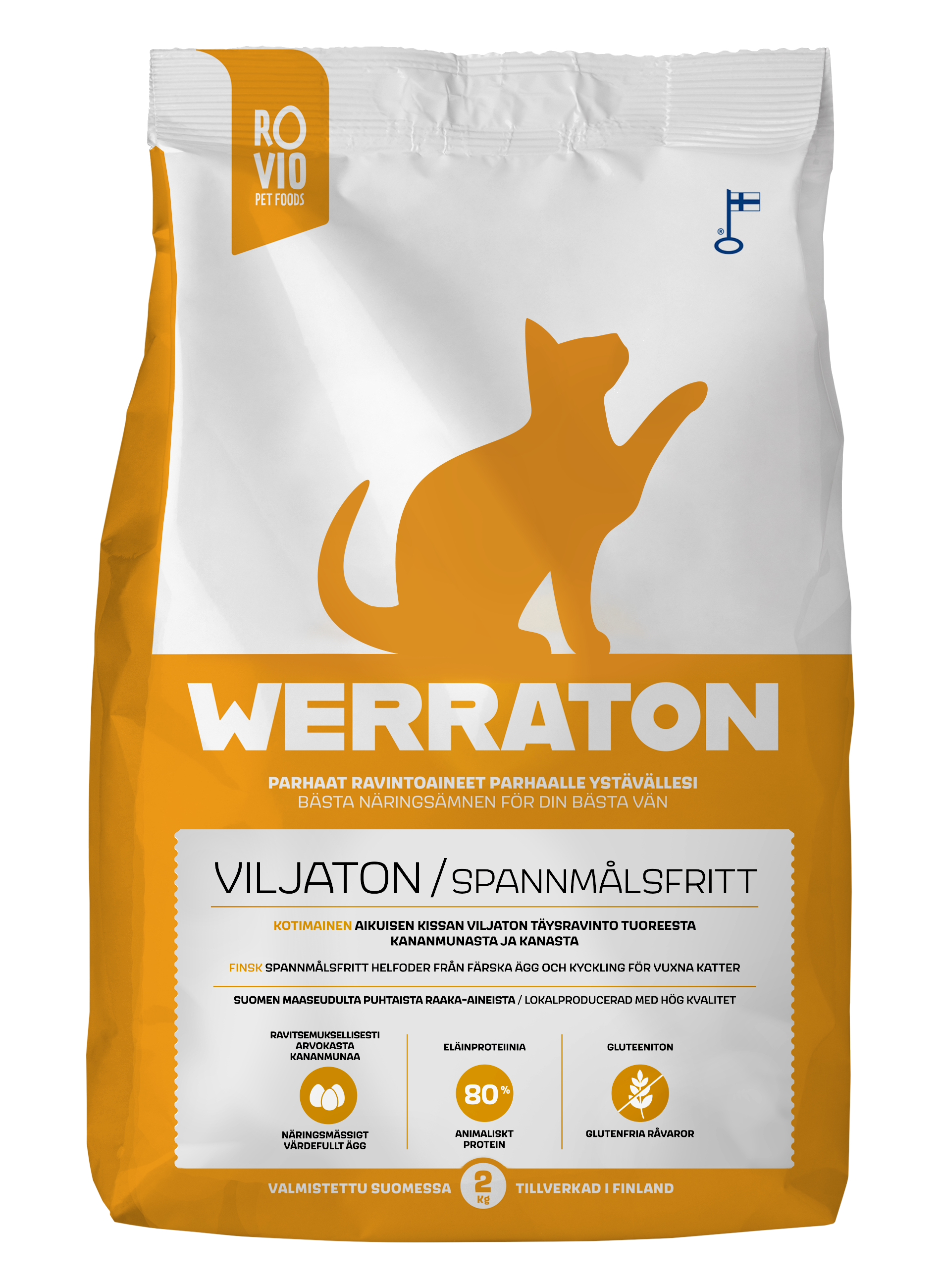 Suomessa valmistettu Werraton Viljaton -kissanruoka on maistuva eläinravitsemuksen asiantuntijan kehittämä kotimainen täysravinto. Ruoka sisältää runsaasti herkullista kananmunaa, joka on hyvä proteiininlähde kissalle. Kananmunan lisäksi ruoka sisältää vain siipikarjaproteiinia, perunaa, kuorittua härkäpapua ja pellavaa – ei ollenkaan viljoja. Kananmakuinen kuivaruoka sisältää myös ruoan maittavuutta lisäävää kananmaksajauhetta. Ruoka on luontaisesi gluteeniton ja soveltuu aikuisen kissan yksinomaiseksi ravinnoksi.